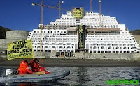 Hoy, en una acción iniciada desde el buque Rainbow Warrior, un grupo de unos 30 activistas han desembarcado en la playa y han procedido a pintar en el frontal del hotel la palabra "ILEGAL". Los vigilantes de seguridad del hotel se han retirado al ver el grupo numeroso de activistas de Greenpeace, y la Guardía Civil simplemente ha registrado sus identidades. La empresa propietaria del hotel poco tardará en volver a pintar de blanco la fachada, pero lo que no podrá borrar es la información que este acto ha generado en todos los medios y que quedará registrada para siempre en Internet.